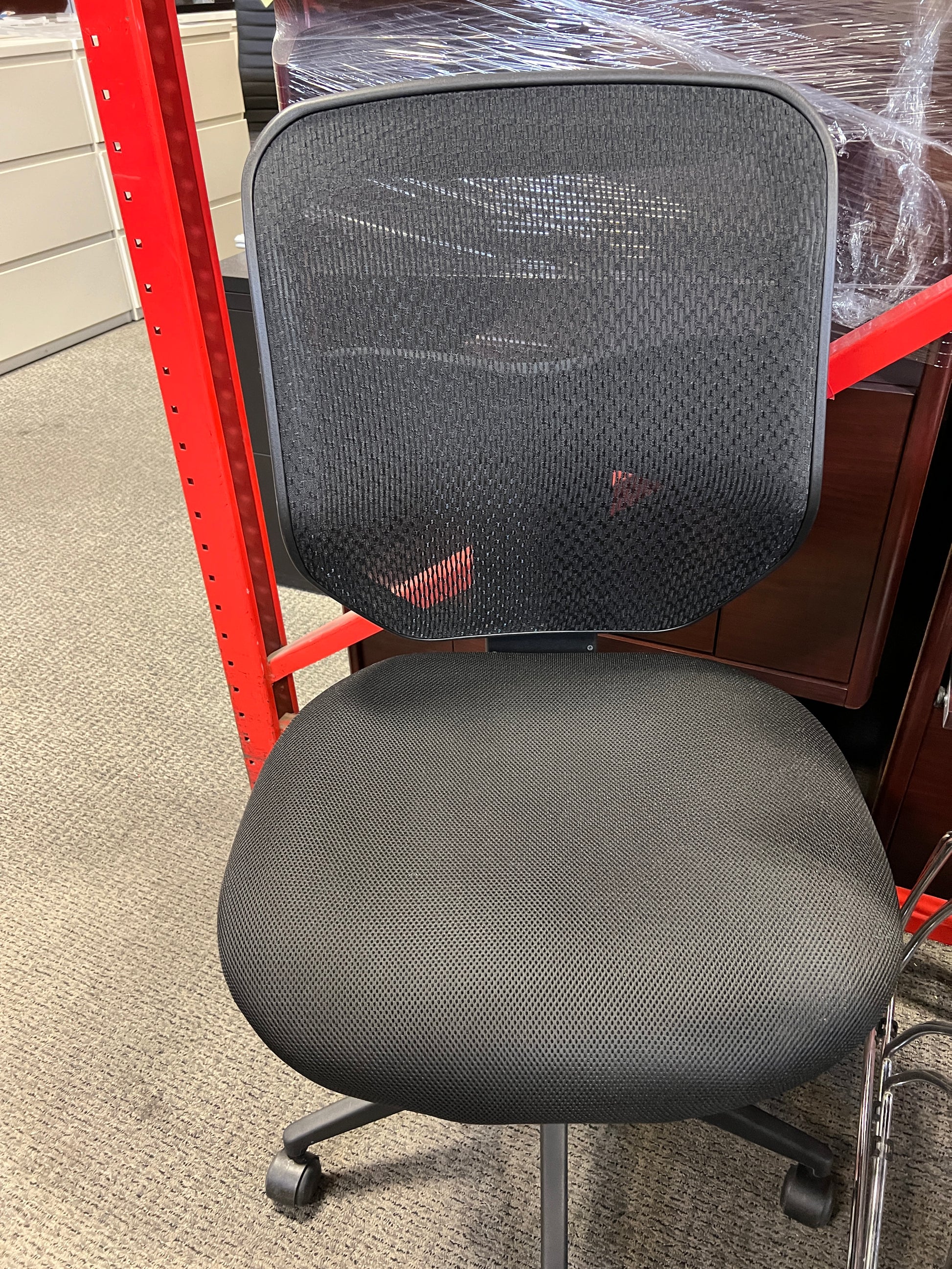This black desk chair features a breathable fabric mesh back to keep you cool and comfortable throughout your workday. Designed without arms, it offers unrestricted movement and easy access to your workspace. Equipped with smooth-rolling casters, this chair provides effortless mobility, making it ideal for dynamic office environments.