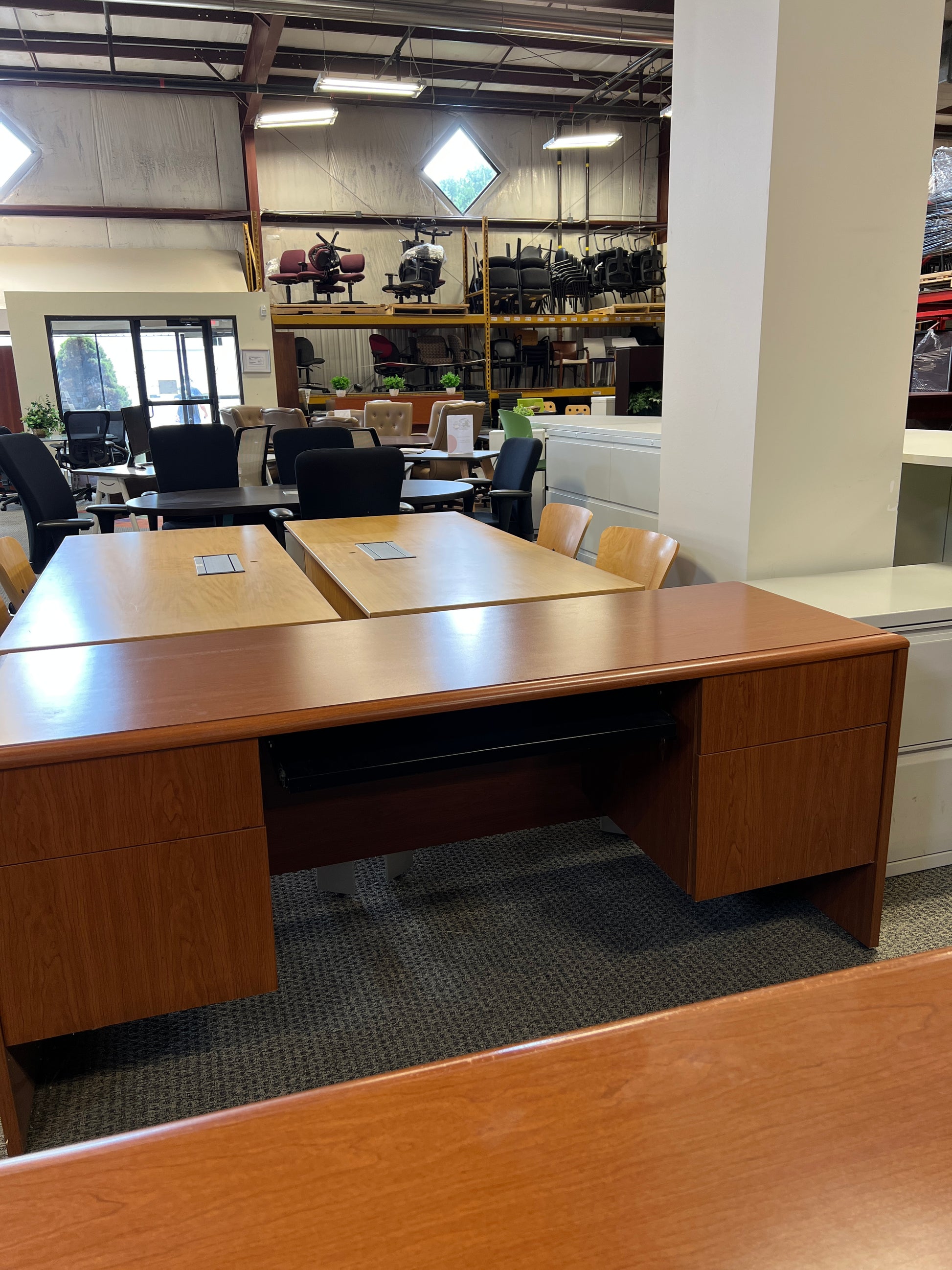 A honey-toned pedestal desk brings warmth and sophistication to any workspace. This classic design features a sturdy single or double pedestal base that maximizes legroom while providing ample storage through integrated drawers. Ideal for executives, professionals, and home offices seeking a timeless piece that combines functionality with refined aesthetics. Durable construction ensures years of reliable performance.